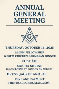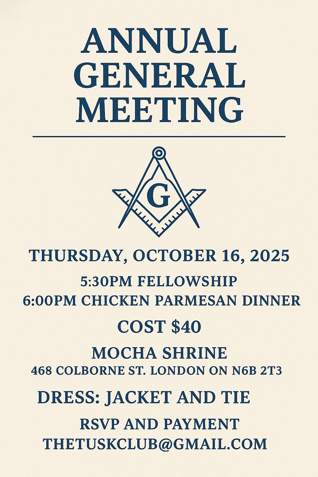Brethren, our Annual General Purpose Meeting will be held October 16 at the Mocha Shrine on Colborne St. Fellowship commencing at 5:30pm with a chicken parmesan dinner at 6pm and meeting to follow. The cost for the dinner will be $40. Please RSVP to [email protected] and you may pay for dinner by e-transfer to that same email address.